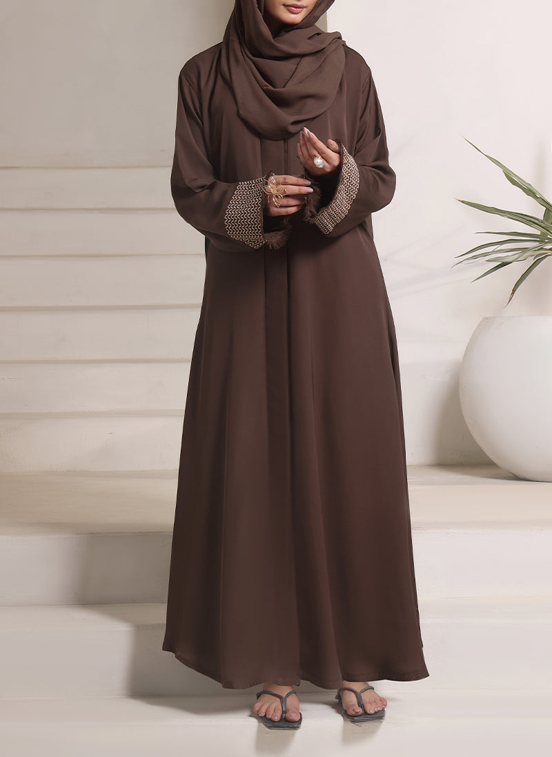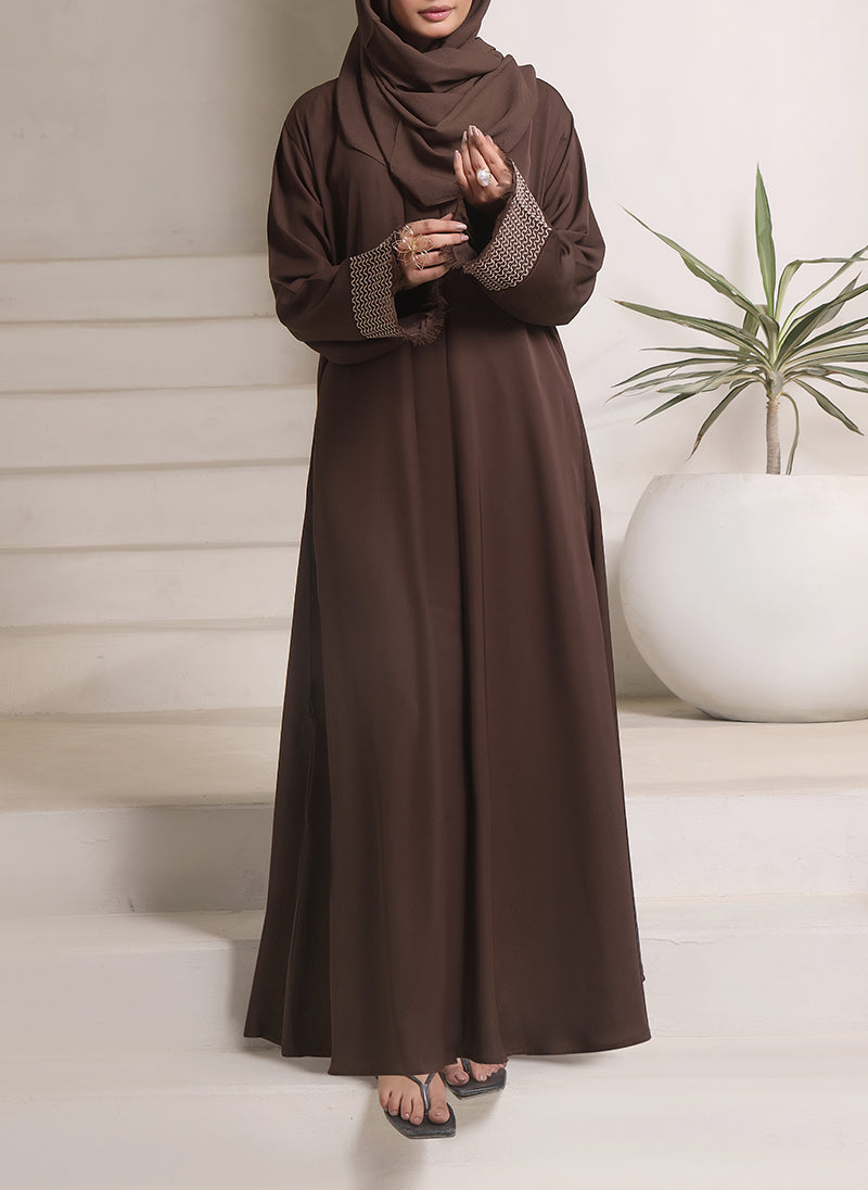 A luxurious, full-length abaya crafted from smooth, high-quality Nida fabric in a deep espresso brown color. It features statement wide cuffs adorned with striking, contrasting geometric wave embroidery, offering a modern, elegant update to classic modest wear.