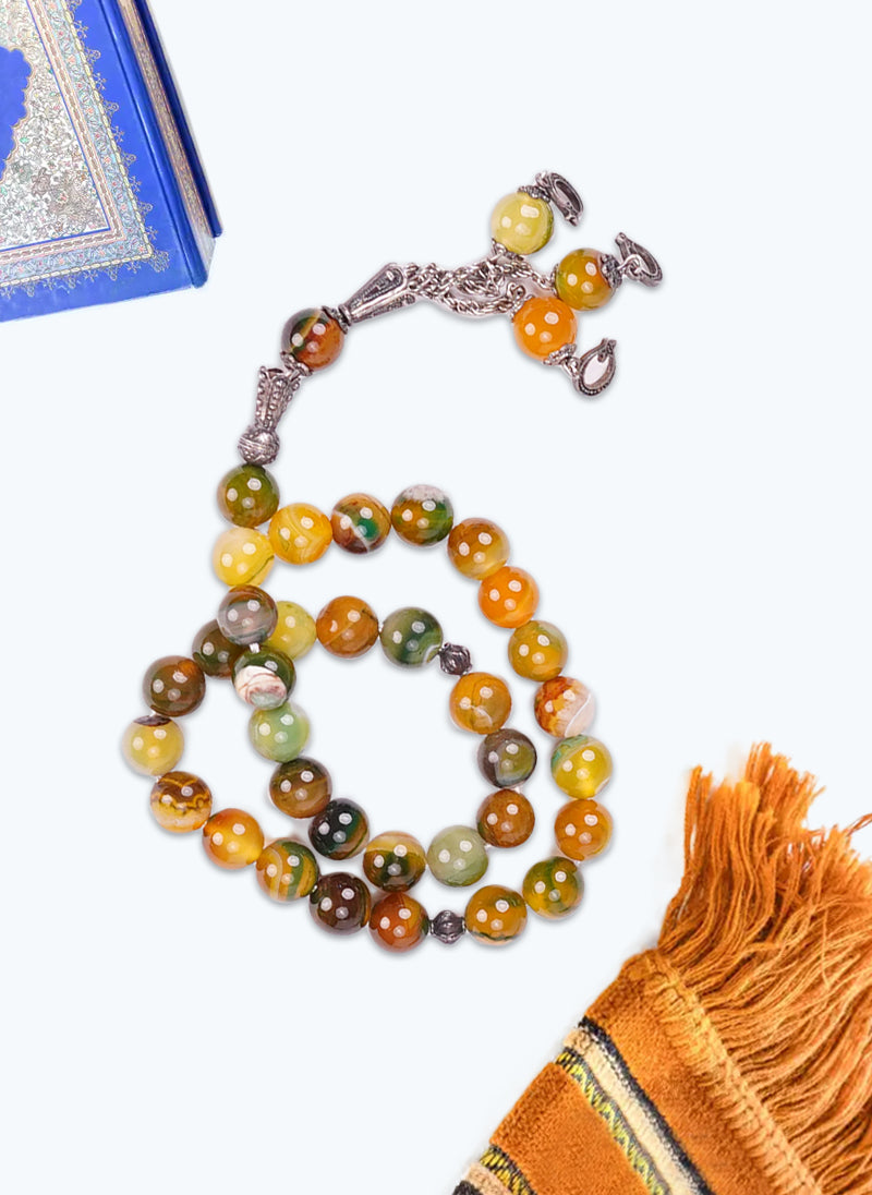 Elevate your spiritual moments with our White Aqeeq Tasbeeh, a beautifully crafted piece made from high-quality multi-toned agate stones. Each bead showcases a unique blend of earthy greens, amber yellows, soft whites, and rich browns, giving the tasbeeh a warm, organic elegance. Polished to a glossy finish with delicate white dot accents, the beads are smooth to the touch and soothing to use during dhikr.