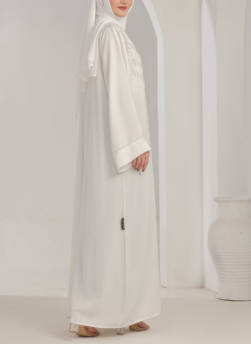 Discover Hijabulhareem?s White Hand Work Abaya from the Mirha Collection ? a stunning mix of tradition and contemporary elegance. Made with premium Zoom fabric, featuring exquisite handwork detailing in white and black. Perfect for modest fashion lovers seeking comfort and style. SKU: 0116-J-1076.