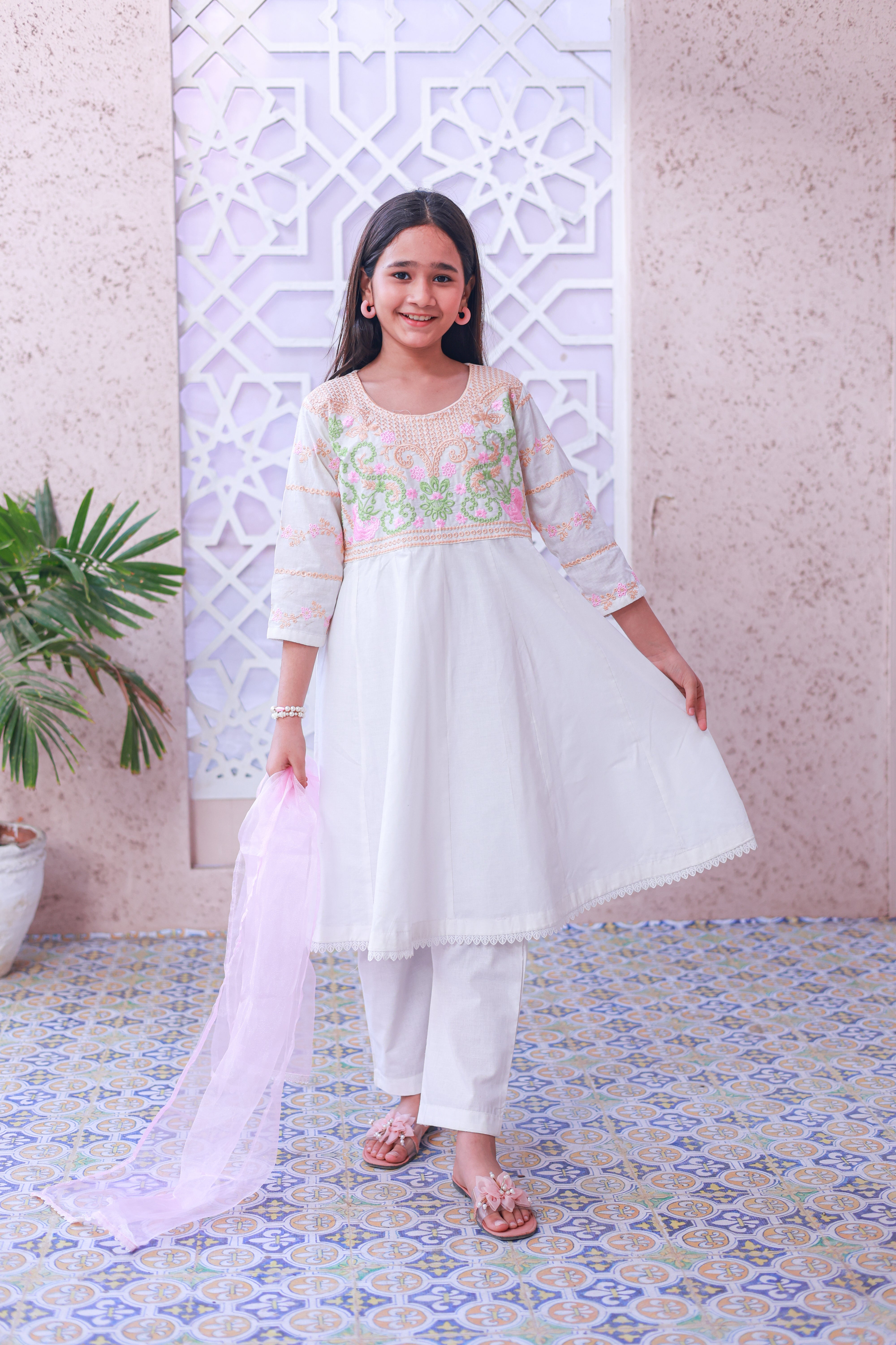 Fabric: Fine Soft Cotton Pattern: Hand Embroided Color: White Design/Cut: Frock + Trouser + Dupatta Elevate your child's fashion game with Khanak's Stitched Cotton Frock and Trouser set. Crafted specifically for kids, this sophisticated ensemble showcases high-quality cotton jacquard fabric, offering a perfect blend of style and comfort. Ideal for both casual and semi-formal events, it’s a must-have addition to their wardrobe. This product is designed for all seasons.
