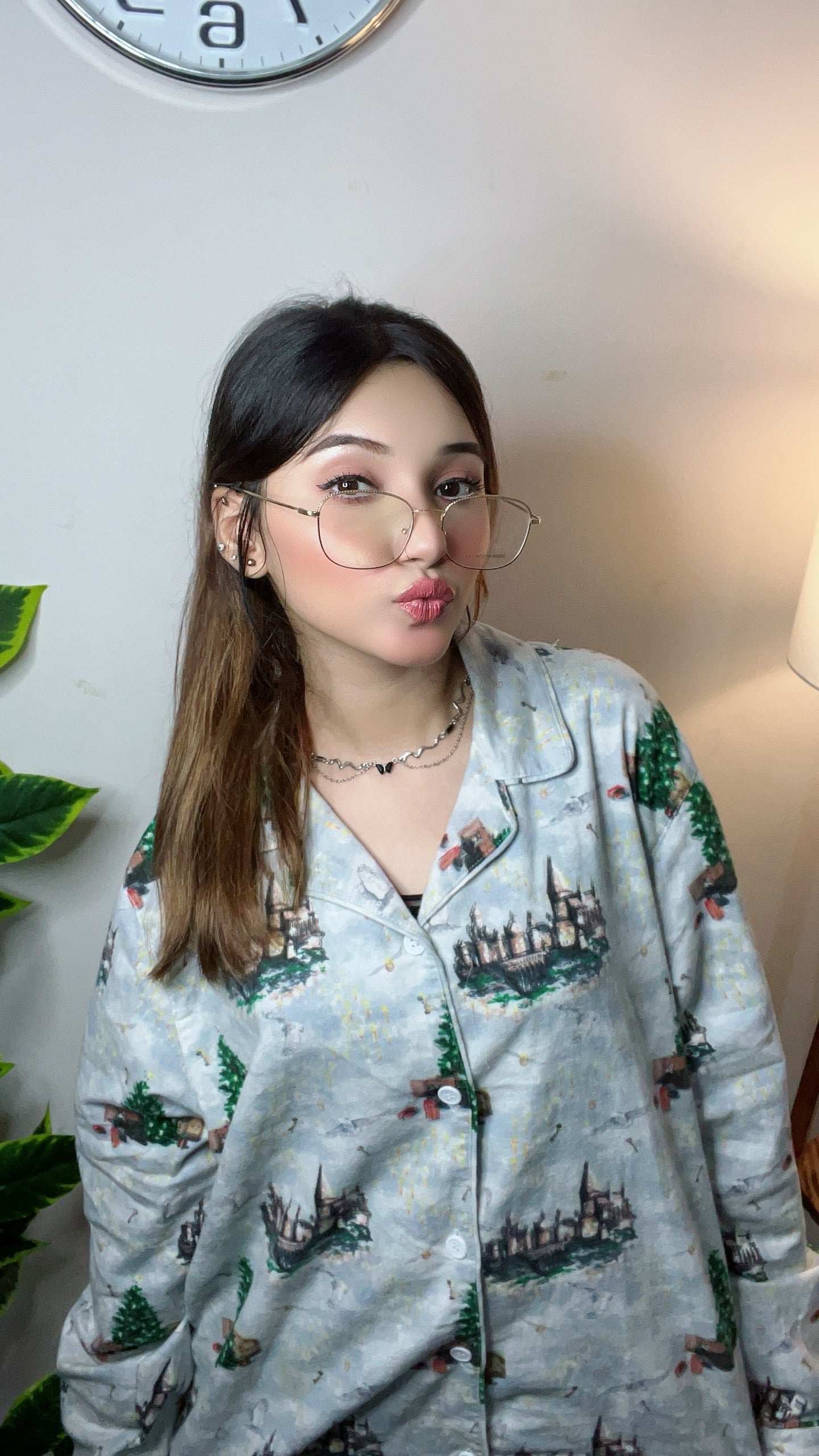 Add a dreamy touch to your nights with this 2-piece women pajama suit, showcasing a scenic castle and nature print. Made from breathable fabric with a button-down shirt and matching trousers for all-night comfort.
