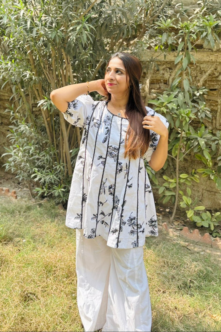 The top features a beautiful floral print with delicate lace detailing, adding a touch of elegance without trying too hard. Paired with relaxed Dhaka-style wide-leg pants, this outfit gives you that effortless vibe — stylish but super comfortable.