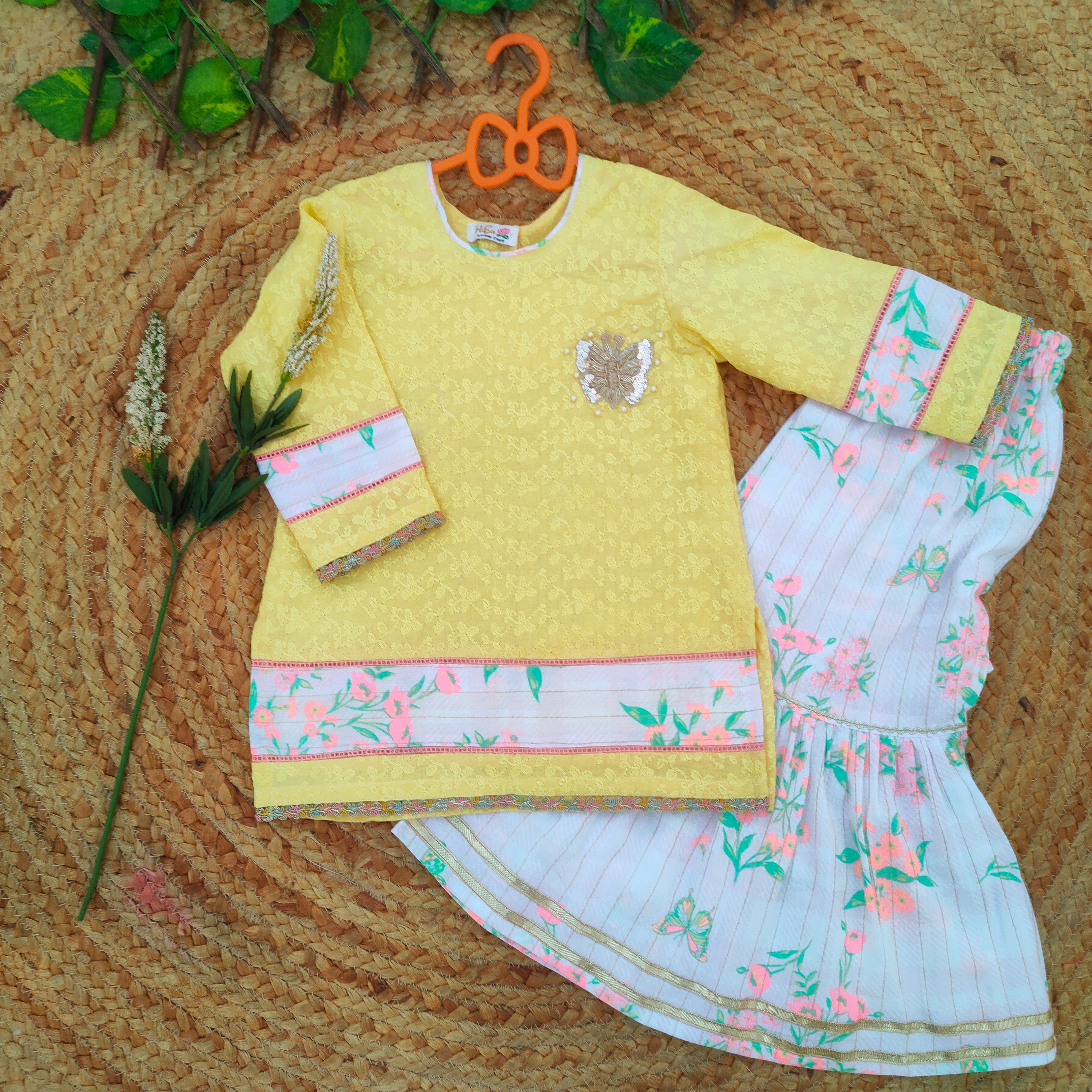 2 pcs festive chikankari short shirt with printed lawn gharara pants, adorned with fancy laces and hand work butterfly motif.