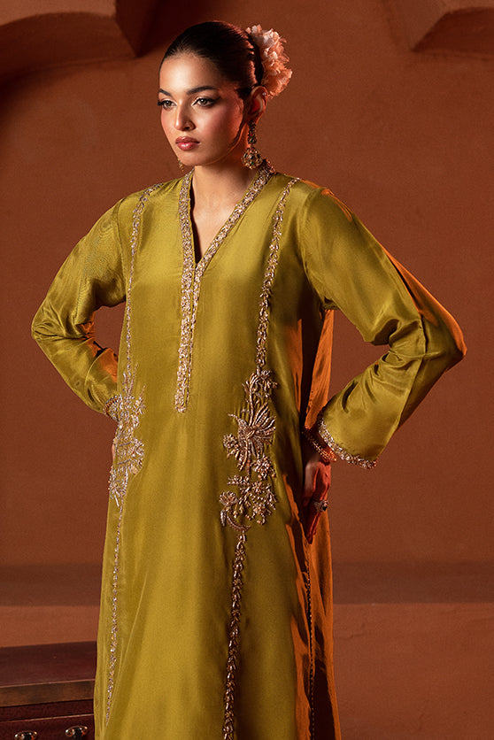 Indulge in the elegance of our sage green ensemble, crafted from rich pure Sheesha Silk. The straight-cut long shirt features intricate embroidery with dabka, kora, sequins, pearls, and zari, paired with matching straight pants and an exquisite organza dupatta with chan work and fine golden edging.