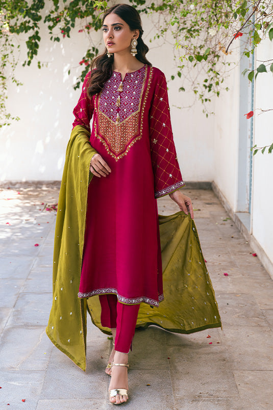 "Leya " is a pink straight shirt with intricate screen print and hand work of kora, dabka, sequins and gota work. The neckline finished with beautiful hangings. It is paired with matching straight pants and green tissue silk duptta with gota and chan work.