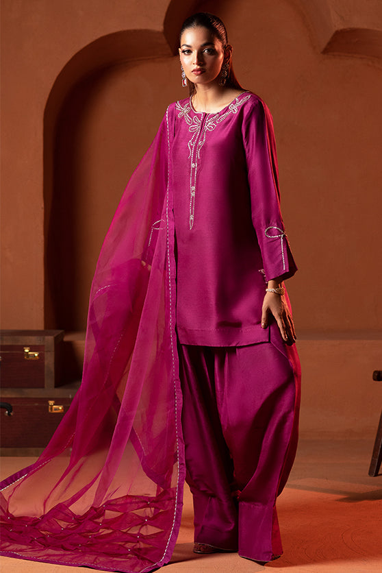 Add a touch of glamour to your wardrobe with our magenta ensemble, intricately embellished with sparkling diamanté. The outfit features a farshi shalwar and an organza dupatta with delicate fabric manipulation and lace trimming, offering both comfort and sophistication.