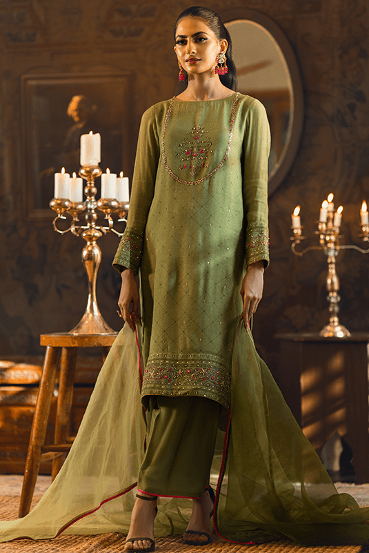 "Mirana" is an A-line Kurta with a dark green screen printed base. The neckline and bottom of the dress is hand embellished with gold zari, pearls, sequins, zardozi and contrasting pink resham. This is paired with green culottes finished with pink and gold edging. The look is completed with a light and dark green organza dupatta with pink lace to finish the dupatta.