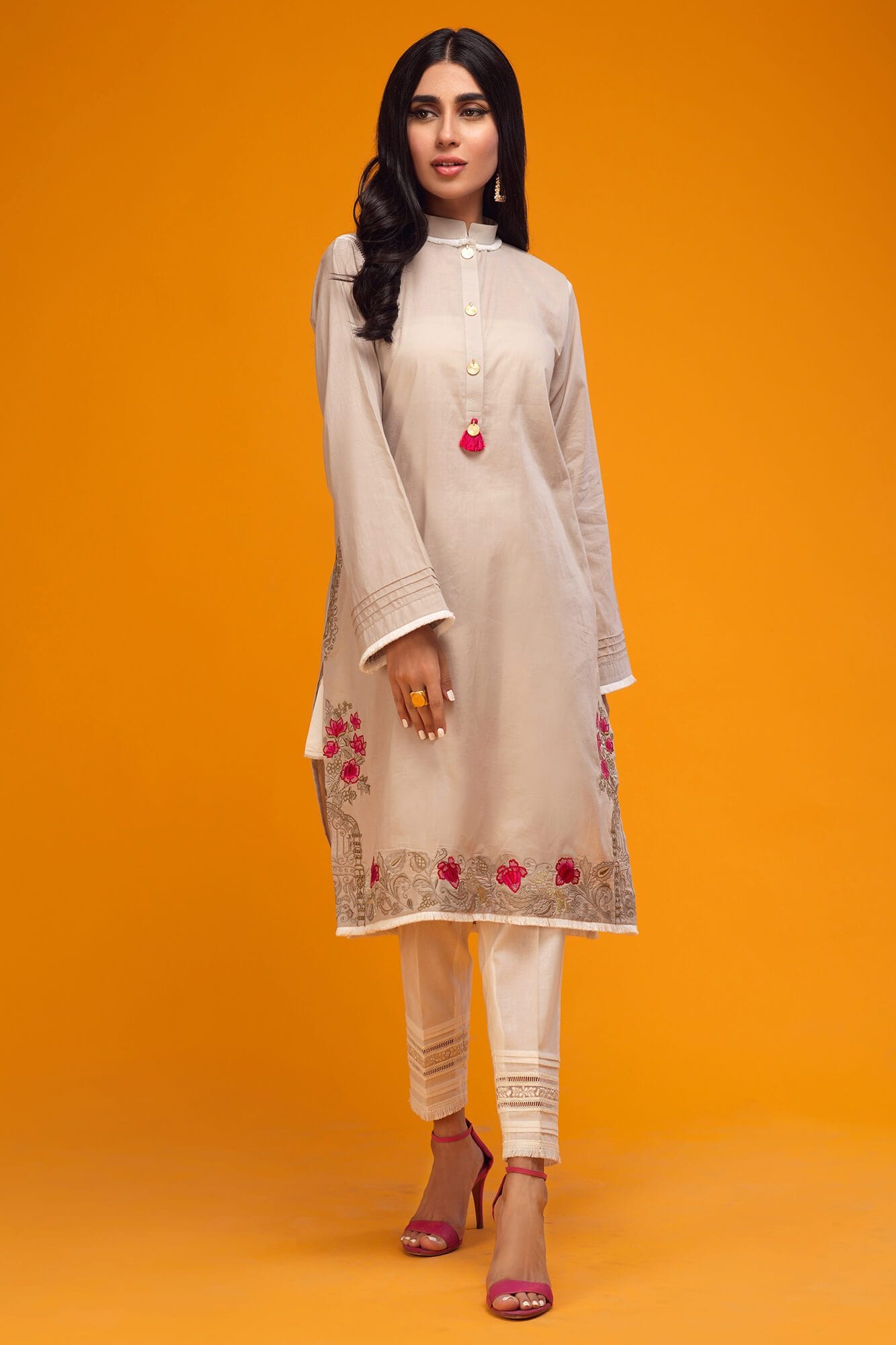 'Mystic Roses' is a beige cotton lawn shirt decorated with delicate embroidery on daaman and side pockets. Having a bend collar with lace embellishments on collar, sleeves, armholes and daaman detailed with antique coins on neckline.
