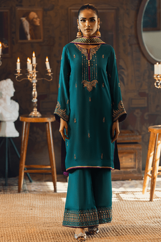 "Nahal" is a PK raw silk green kurta with intricate zardozi work in the front and on the sleeves. It is embellished with pearls, sequins, crystals and contrasting purple resham. The neckline is finished with buttons to complete the look. The culottes are finished with hand embroidered borders. It is paired with a two-colored dupatta in contrasting colors purple and green, with heavy embroidery on the pallu to complete the look.