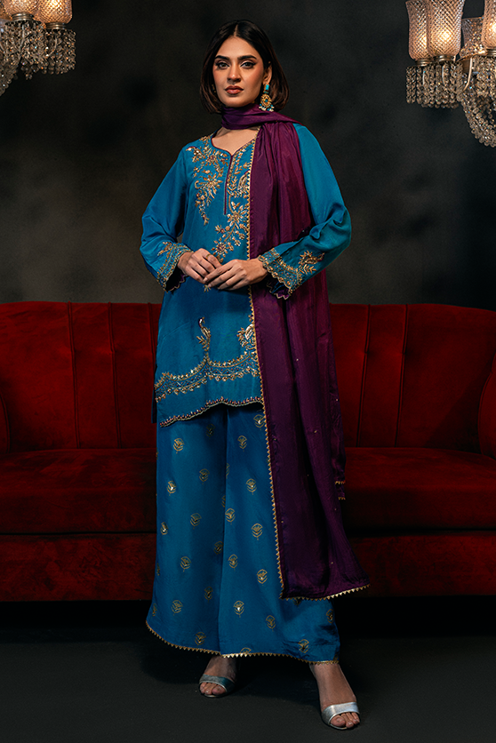 This is a hand embroidered short shirt with zari, dabka, kora , sequence, pearl, gota and resham with cut work on daman and sleeves .it is paired with matching flared pant with screen print work and gota touching. It is paired with tissue silk purple duppatta with chan work and lace finishing.