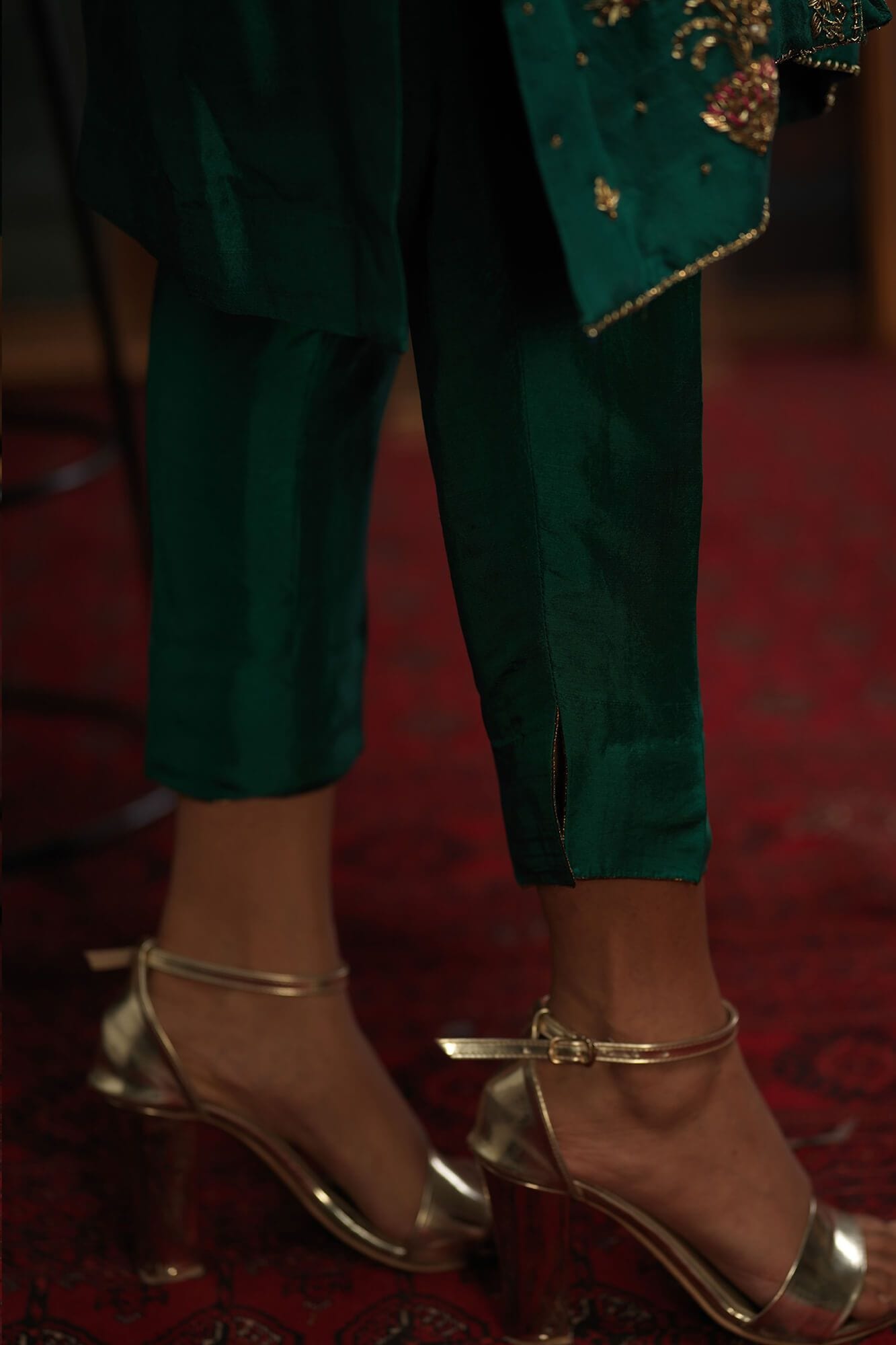 Pk Raw Silk Open Slit Pant. Fabric: PK Raw Silk Color: Emerald Green Model Height: 5'7 Model Wearing: Small Size DRY CLEAN...