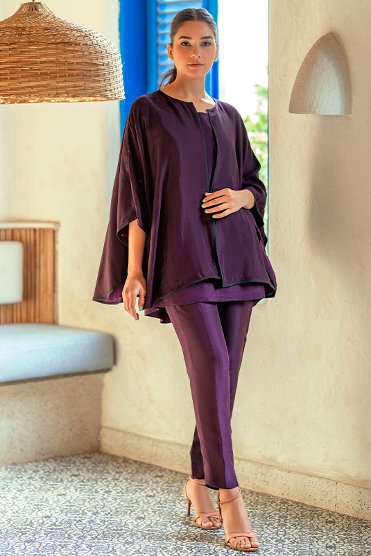 Violet is a cotton silk co-ord set which consists of a top in the form of a loose cut cape. It comes with an accompanying slip. It is paired with matching straight pants.