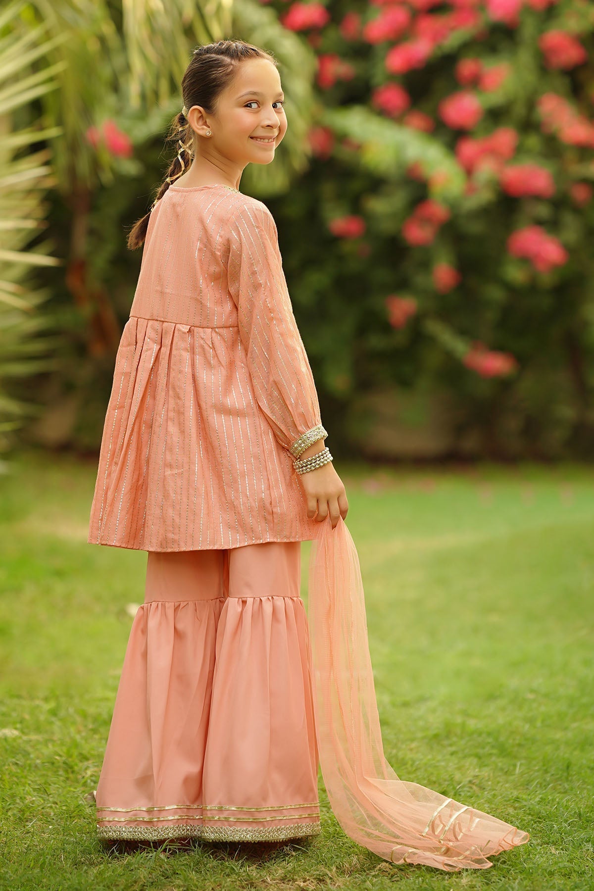 Top: Peach Zari Jacquard Kurta with Laces, Tassel and Malai Crepe LiningBottom: Peach Malai Crepe Gharara Pants with LacesDupatta: Peach Soft Net Dupatta