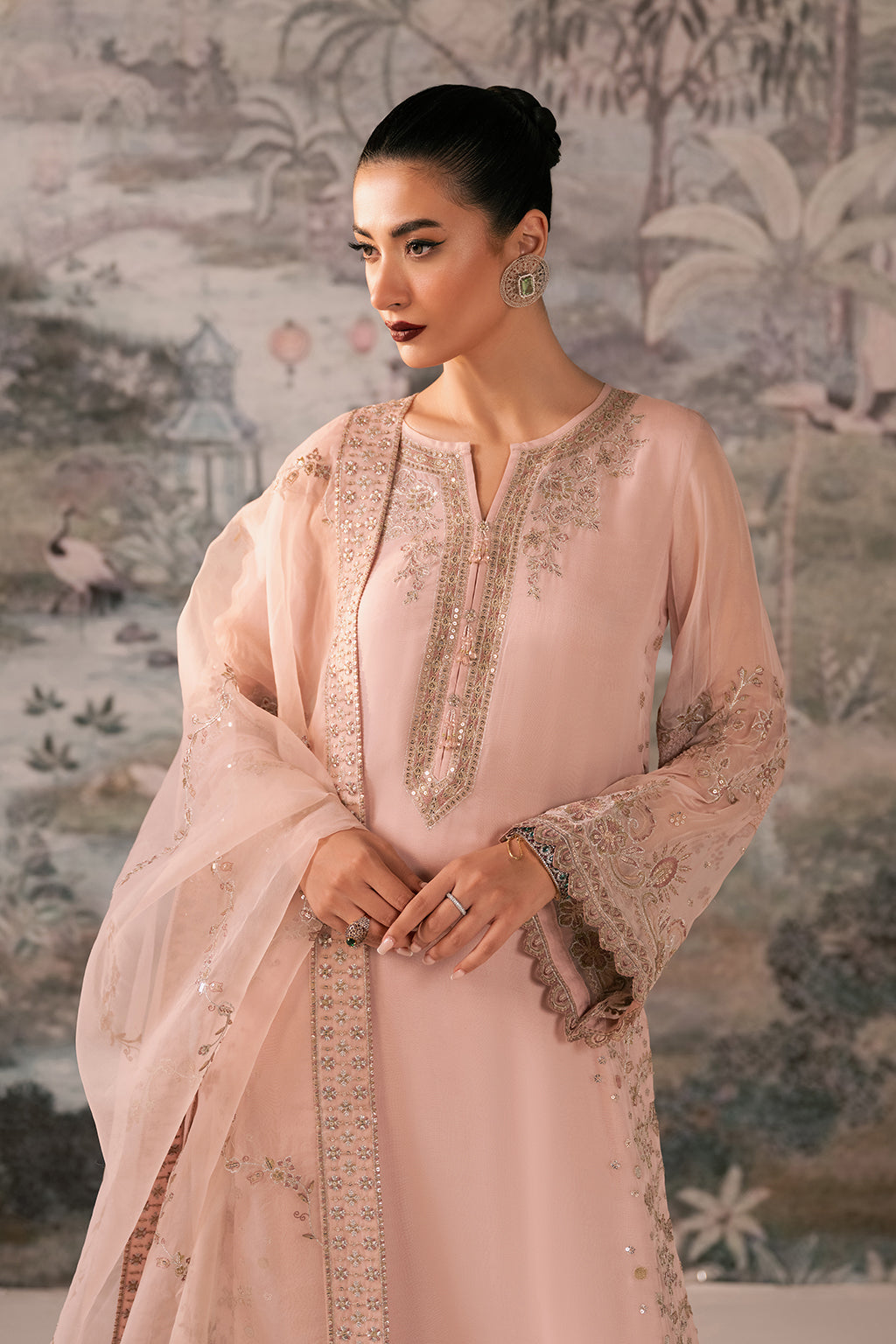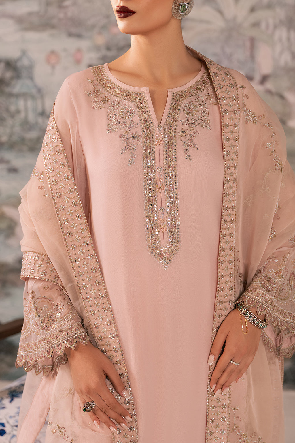 This graceful chiffon shirt is embellished with intricate embroidery, featuring touches of silver sequin and tilla work for added elegance. The ensemble includes a plain raw silk trouser, offering a classic and refined look. The organza dupatta, adorned with all-over sequin embroidery and finished with four-sided borders, perfectly complements the outfit, making it an ideal choice for special occasions.