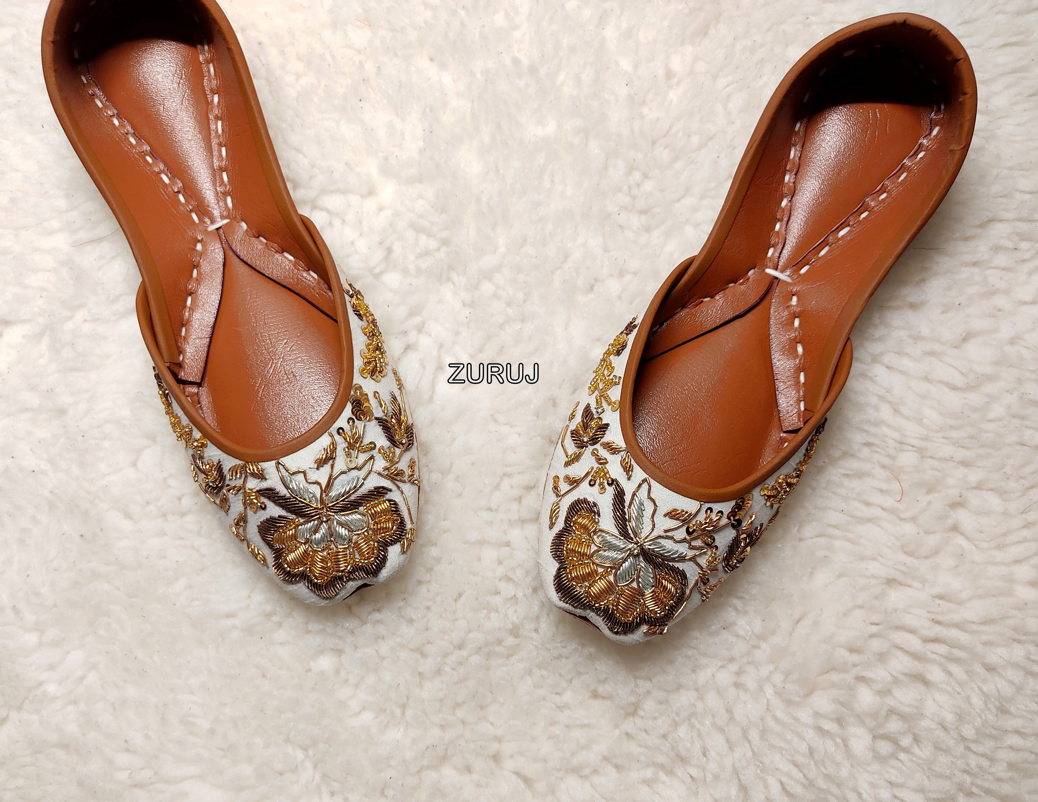 Zun-109 is a quintessential exemplary of pleasant, luxurious and traditional artistry made on white base with golden and copper handmade dabka work . These are the adorable heritages of Pakistan that are hand-sewed by determined cordwainers of rural areas to exhibit the utmost beauty of prepossessing feet.