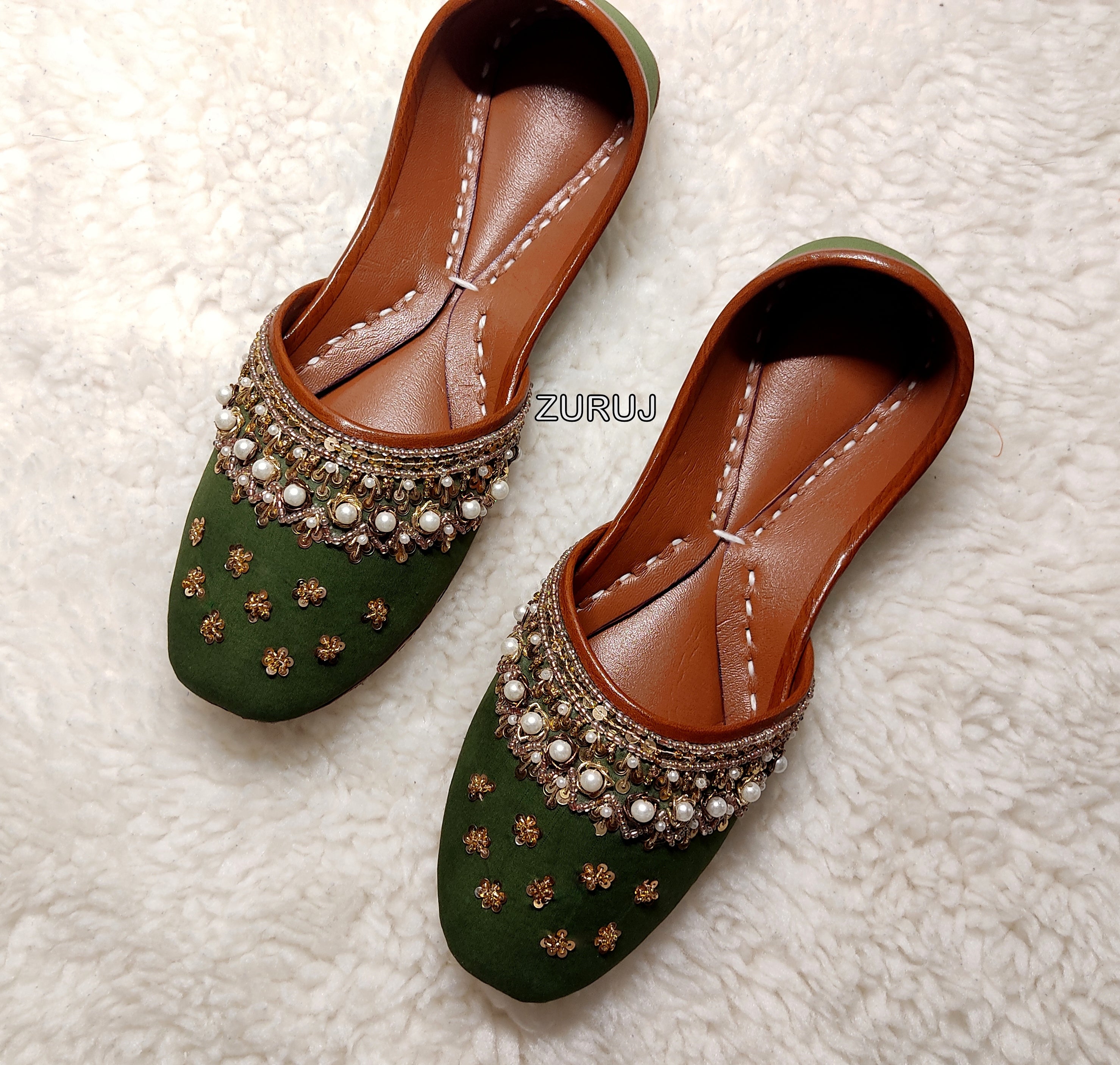 Zun-120 is a quintessential exemplary of pleasant, luxurious and traditional artistry made on green base with golden color beautiful handmade embroidery and dabka work. These are the adorable heritages of Pakistan that are hand-sewed by determined cordwainers of rural areas to exhibit the utmost beauty of prepossessing feet.
