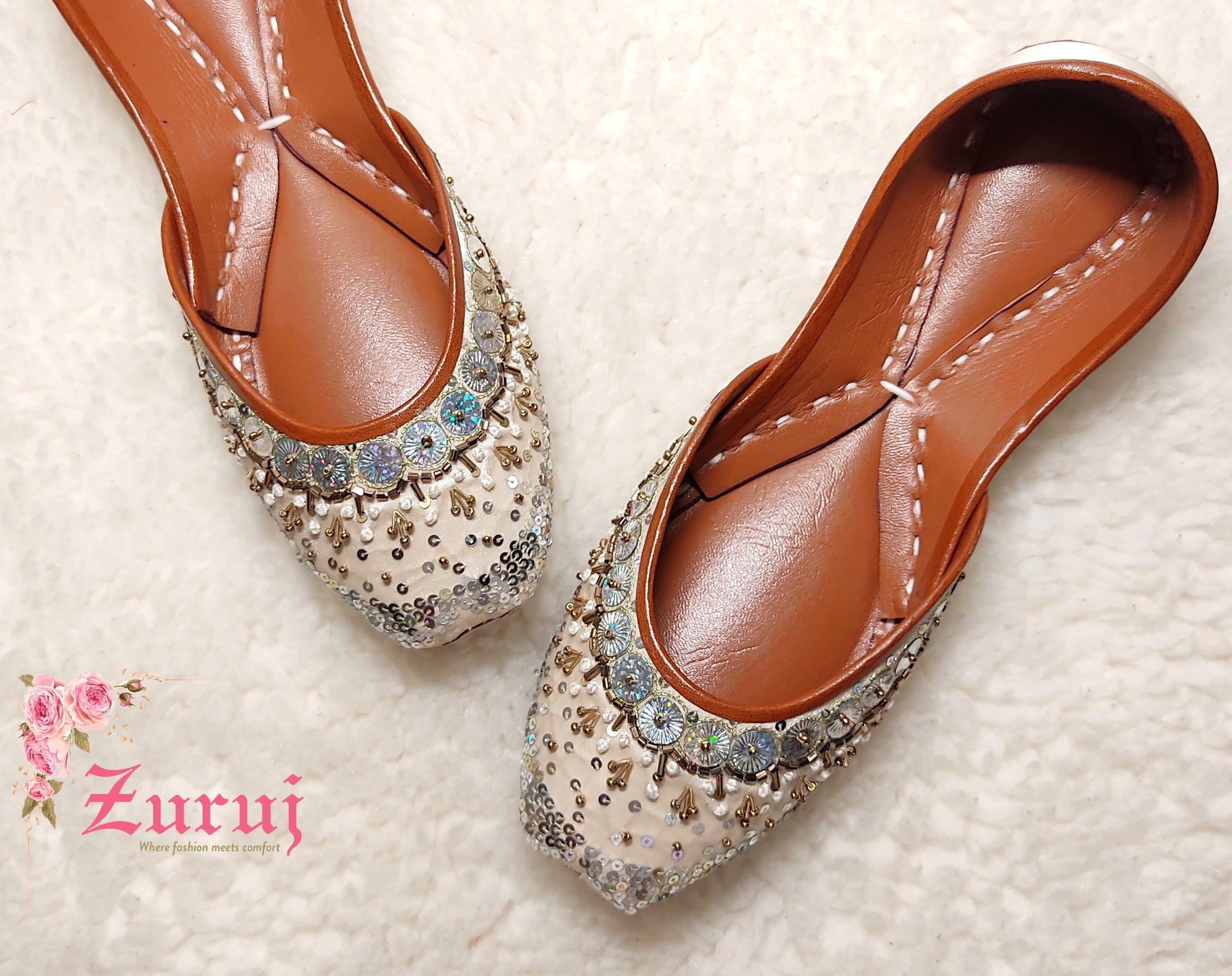 Zun-127 is a quintessential exemplary of pleasant, luxurious and traditional artistry made on off white cream base with beautiful handmade embroidery, ari and dabka work. These are the adorable heritages of Pakistan that are hand-sewed by determined cordwainers of rural areas to exhibit the utmost beauty of prepossessing feet.