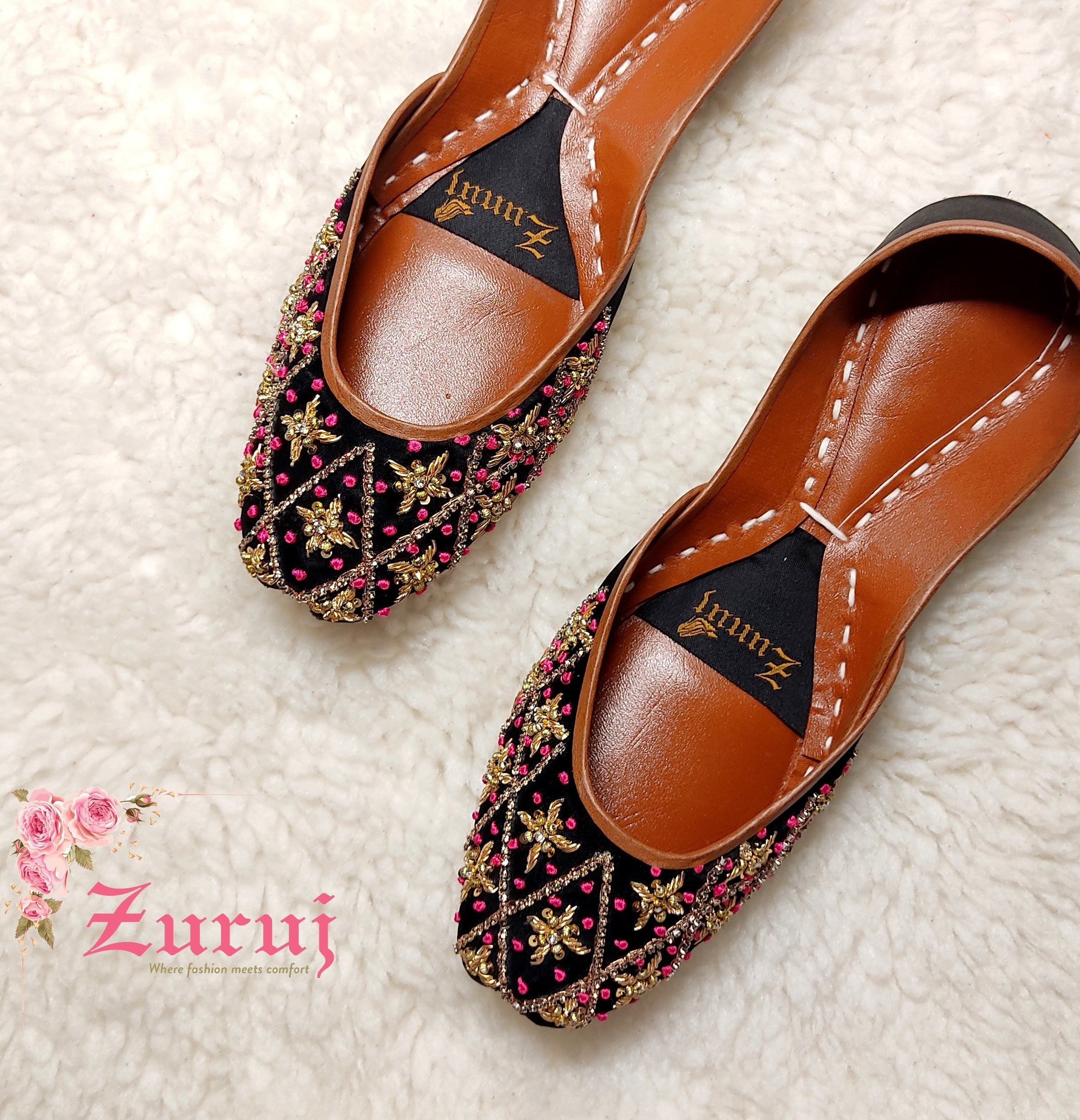 Zun-146 is a quintessential exemplary of pleasant, luxurious and traditional artistry made on black base with golden and pink combination . These are the adorable heritages of Pakistan that are hand-sewed by determined cordwainers of rural areas to exhibit the utmost beauty of prepossessing feet.