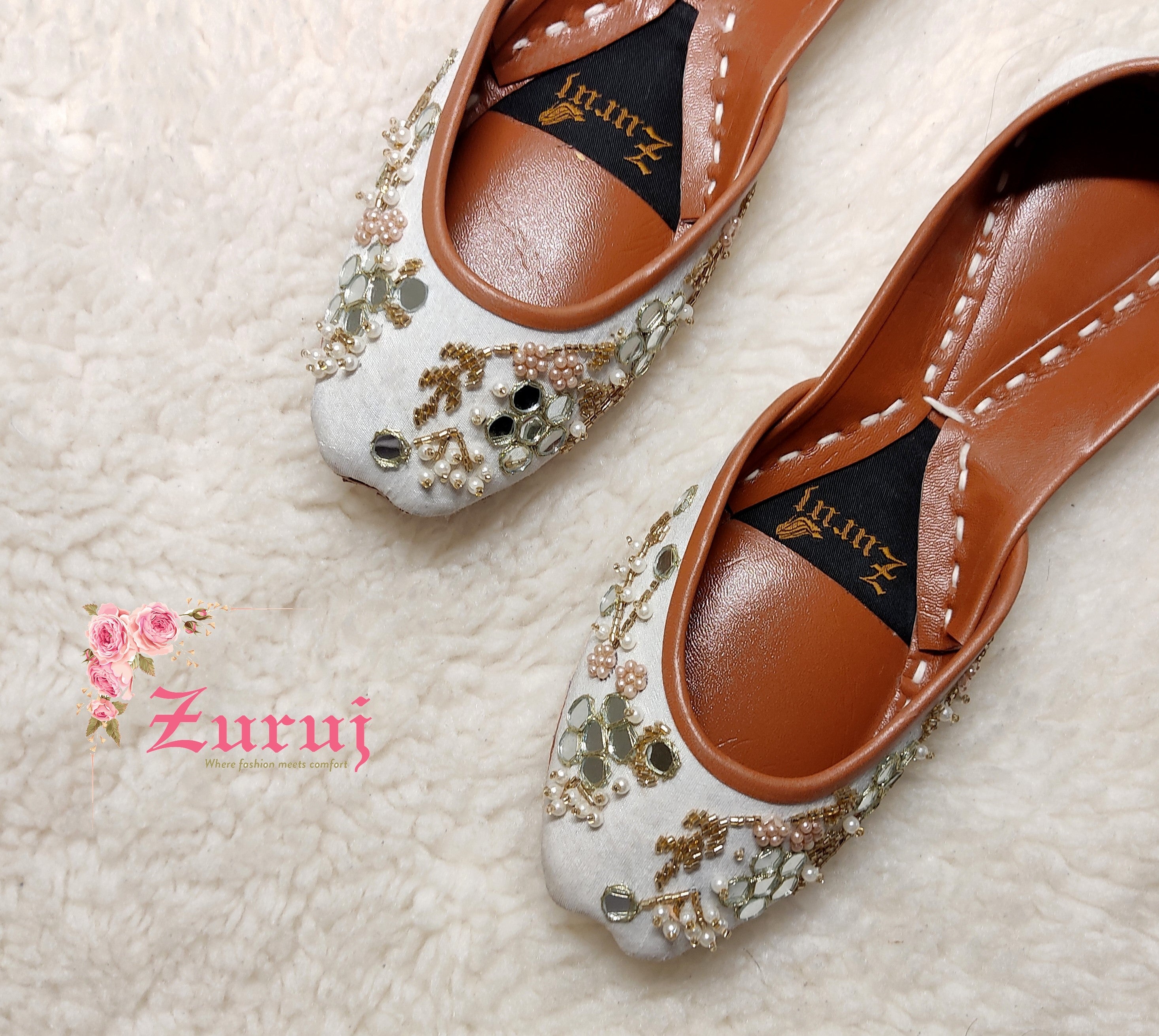 Zun-165 is a quintessential exemplary of pleasant, luxurious and traditional artistry made on white base with beautiful hand made work. These are the adorable heritages of Pakistan that are hand-sewed by determined cordwainers of rural areas to exhibit the utmost beauty of prepossessing feet.